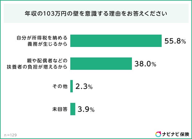 回答者のうち約41%の人が「年収103万円の壁を意識している」と答えました。その理由としては、「自分が所得税を納める義務が生じるから」と回答した人が約55.8%、「親や配偶者などの扶養者の負担が増えるから」と回答した人が約38%という結果になりました。