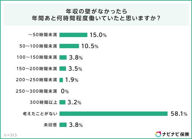 「年収の壁がない場合、年間あと何時間程度働いていたと思いますか?」という質問では、「考えたことがない」と回答した人が半数以上おり、次いで「~50時間未満」「50~100時間未満」と回答した人が多い結果となりました。