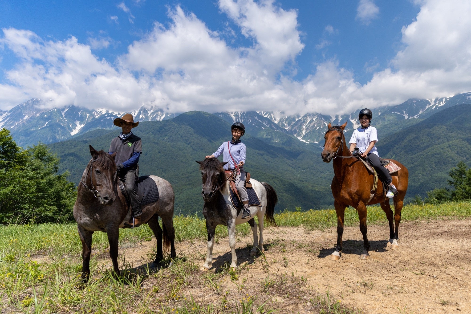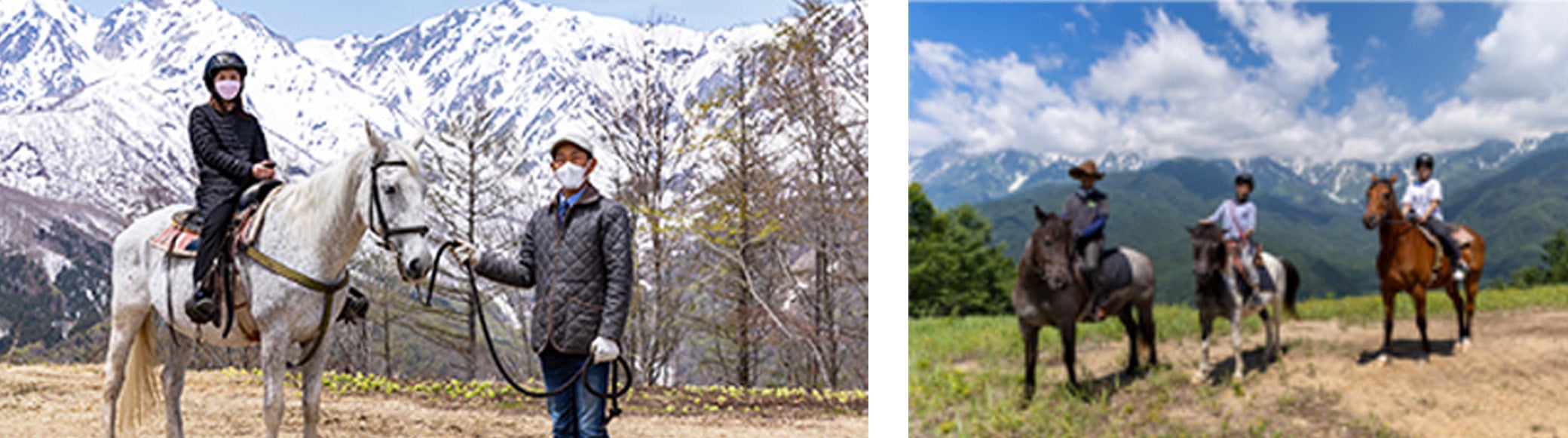 標高約1,300mの白馬岩岳山頂エリアは爽やかな風が吹き抜け、訪れるだけで日々の喧騒を忘れさせてくれる空間ですが、馬の息遣いや揺れを感じながら風にそよぐ木々の間を歩み、山々を馬上から眺める経験は格別で、特別な思い出として心に残ることでしょう。五感に働きかけるアクティビティとホテルステイで、従来の観光にとどまらない新たな白馬の楽しみ方を提案します。北アルプスの大自然を楽しみにお越しになるお客様や、アクティブな体験を求めるお客様に是非ご利用いただきたいプランです。