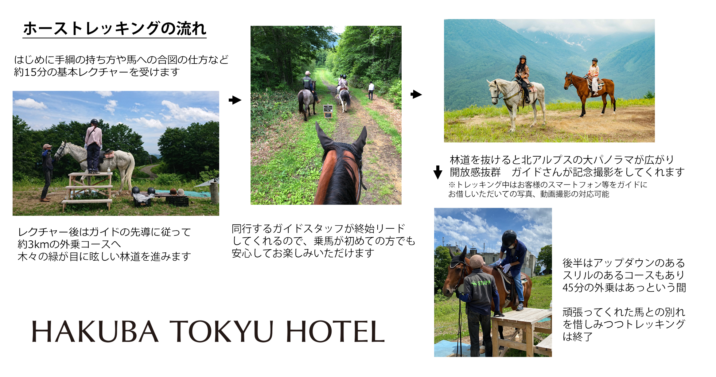 白馬東急ホテル(長野県北安曇郡白馬村 総支配人: 堀内 雅人)は2022年9月1日(木)~11月13日(日)の期間、北アルプスの絶景をバックに乗馬をお楽しみいただけるホーストレッキング付き宿泊プラン「白馬の風を感じる~乗馬プラン」を販売いたします。