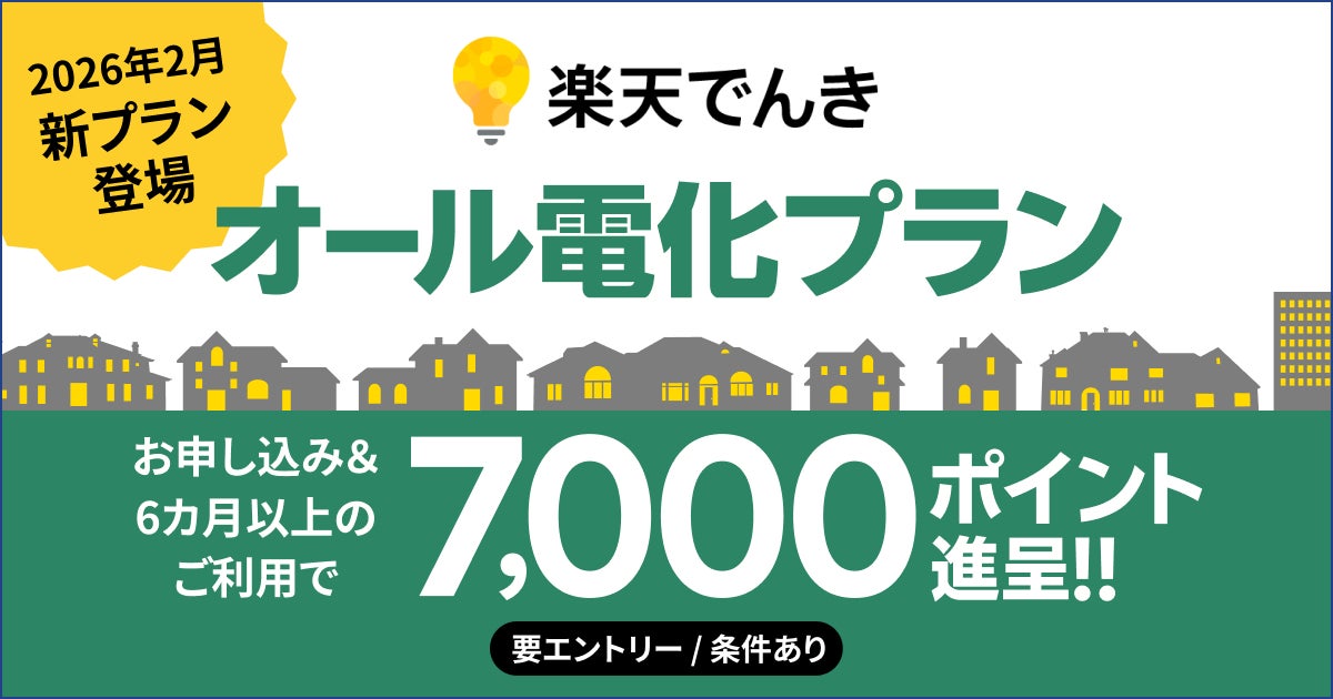 楽天モバイル株式会社(以下「楽天モバイル」)は、2026年2月25日(水)より、個人・家庭向け低圧電力供給サービス「楽天でんき」において、オール電化住宅をご利用のお客様の効率的な電力のご利用を後押しする新料金プラン「オール電化プラン」(以下「本プラン」)を提供開始します。また、本プランの事前エントリーの受付を開始し、本プランを6カ月以上ご利用いただいたお客様を対象に、最大「楽天ポイント」7,000ポイントを還元するキャンペーンを実施します(注1)。