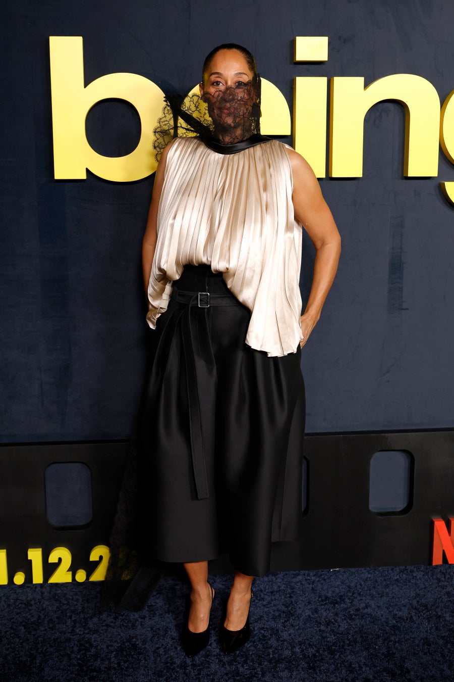 トレイシー・エリス・ロスは、2026年春夏 コレクションのアイボリーシルクとブラックレースのトップスに、ブラックウールのパンツを合わせた装いで登場しました。