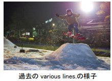 ナイター貸切イベント「various lines.」を開催します。ムラサキスポーツ所属ライダー赤田佑弥プロ等が登場し、ゲレンデを盛り上げます。また、メインゲレンデにキッカーやボックス等を設置した一夜限りの特設パークをオープンし、中上級者のスキーヤースノーボーダーに楽しんでいただきます。