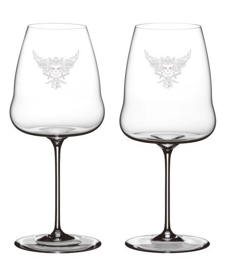 <リーデル>グラス 各13,750円 グラス右 : “RIEDELSKULL WINGS Rosso” グラス左 : “RIEDELSKULL WINGS Sparkling&Bianco”