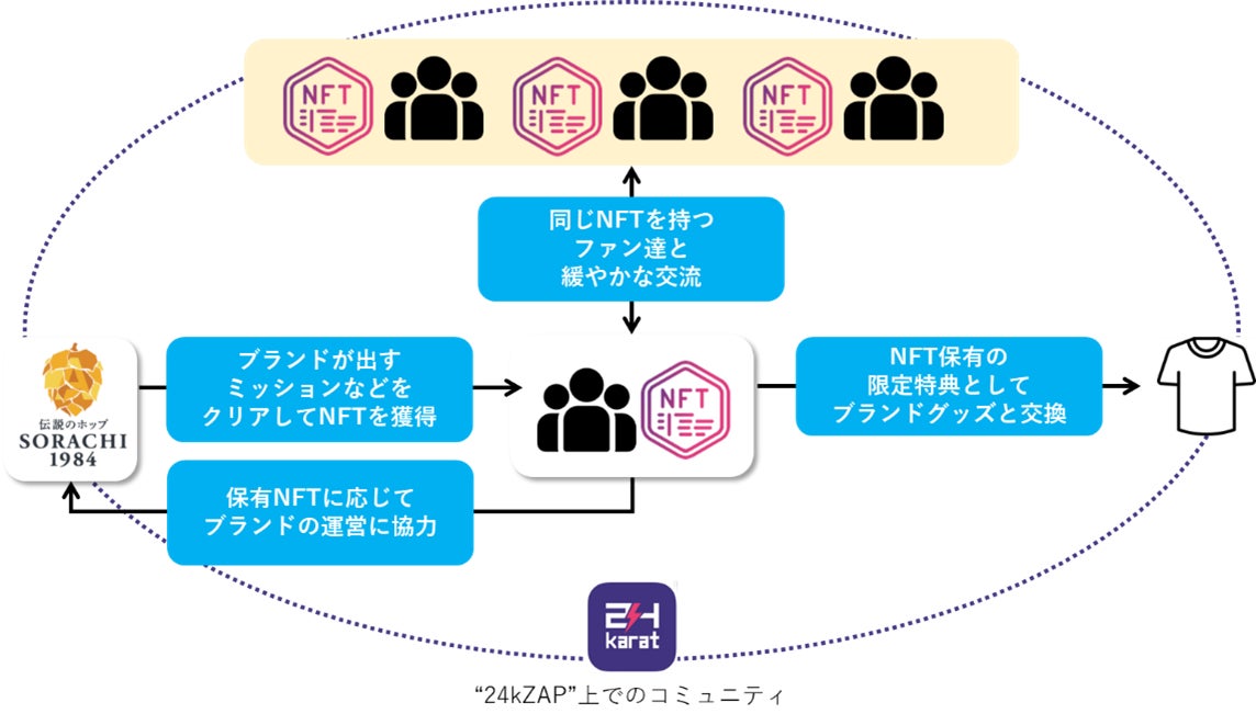 24karat(株)はNFTを活用したコミュニティサービスを運営するスタートアップです。ユーザーが自分自身の「好き」をNFTとして形にしてどこにでも持ち運ぶことができるよう様々なサービスを展開しています。「サッポロ SORACHI 1984」は、24kZAPアプリ内に専用のブランドページを持ち、様々なミッションを通じてトークンを集めることでブランド専用のNFTを獲得できるなど、新しい体験をお届けしています。