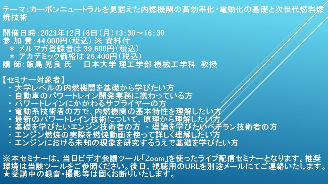 【ライブ配信セミナー】カーボンニュートラルを見据えた内燃機関の高効率化・電動化の基礎と次世代燃料燃焼技術 12月18日(月)開催 主催:(株)シーエムシー・リサーチ