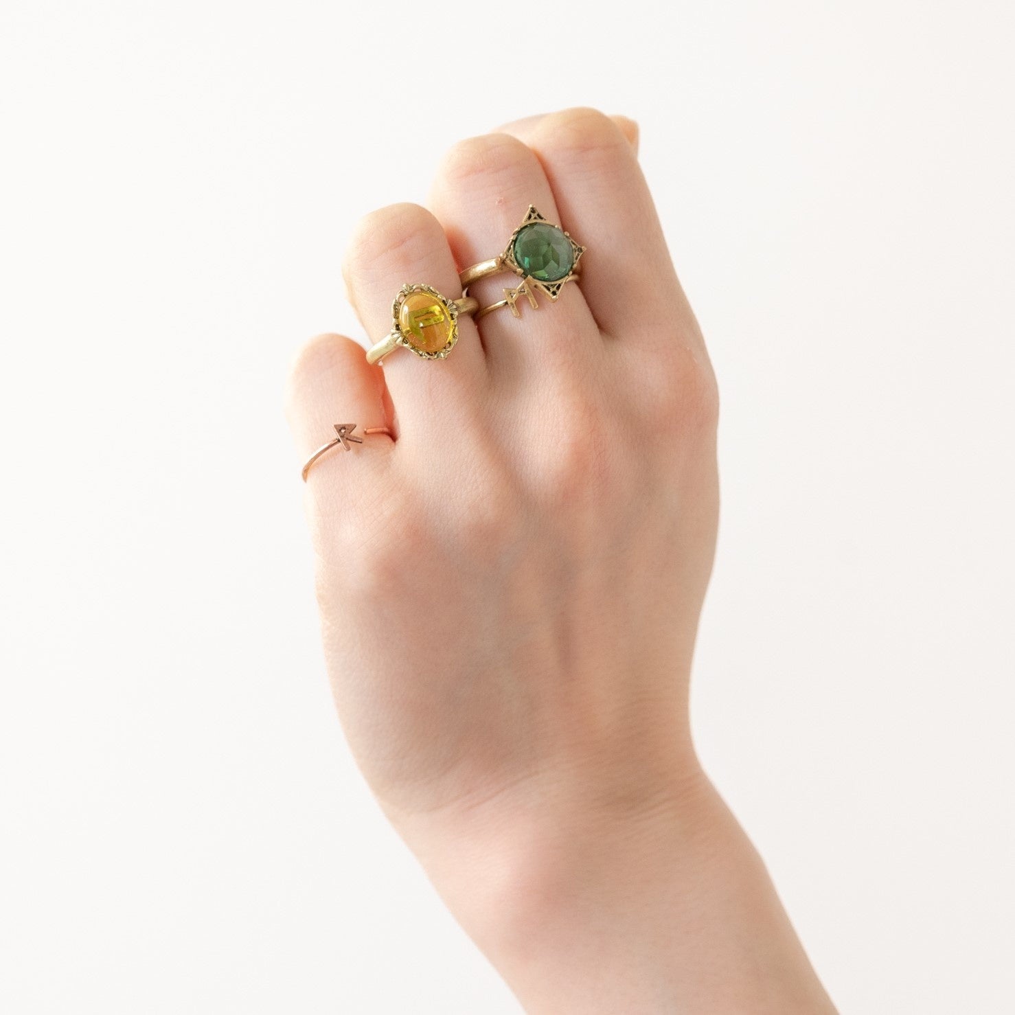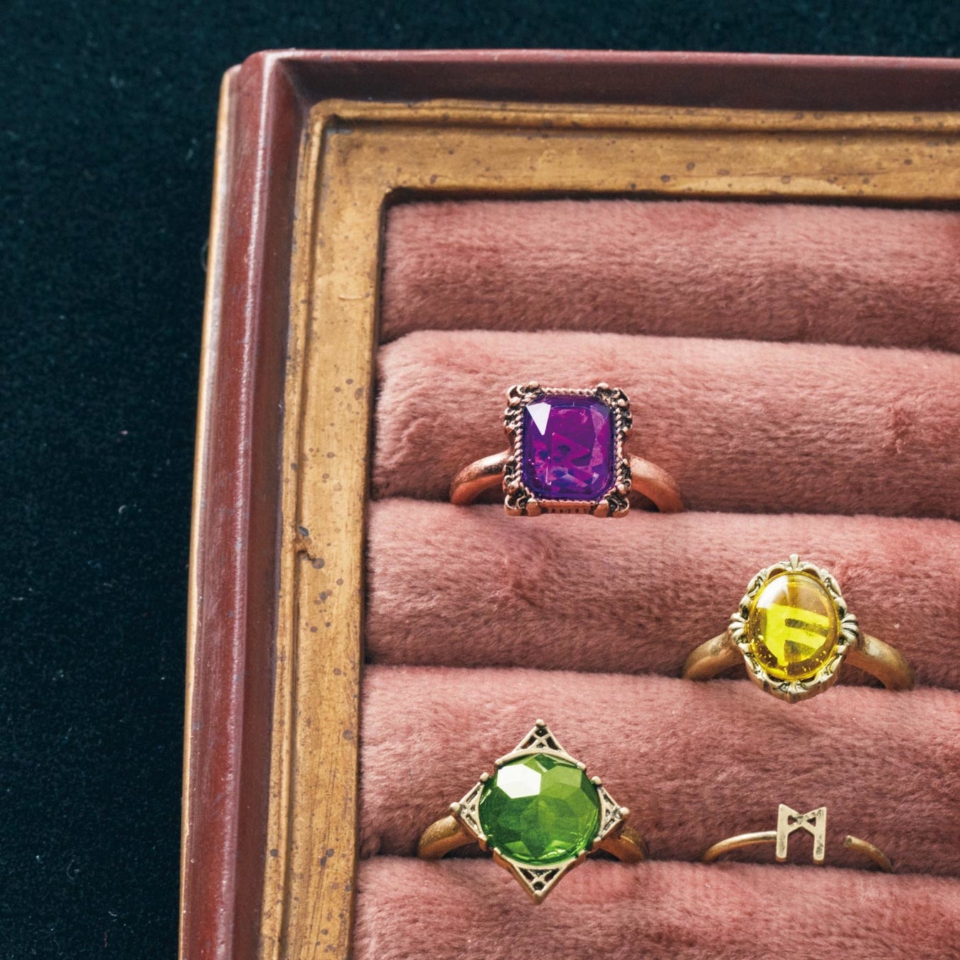 華奢(きゃしゃ)でアンティークな見た目にときめく、おまじないの意味を秘めている神秘的なルーン文字をあしらったリングと、宝石のようにきらめくストーンリングのセットです。重ねづけするとルーン文字が透けて浮かび上がる不思議な仕掛けになっています。バラバラに着けたり、3種集めてお好みの色と文字で組み合わせたりして楽しむことができます。