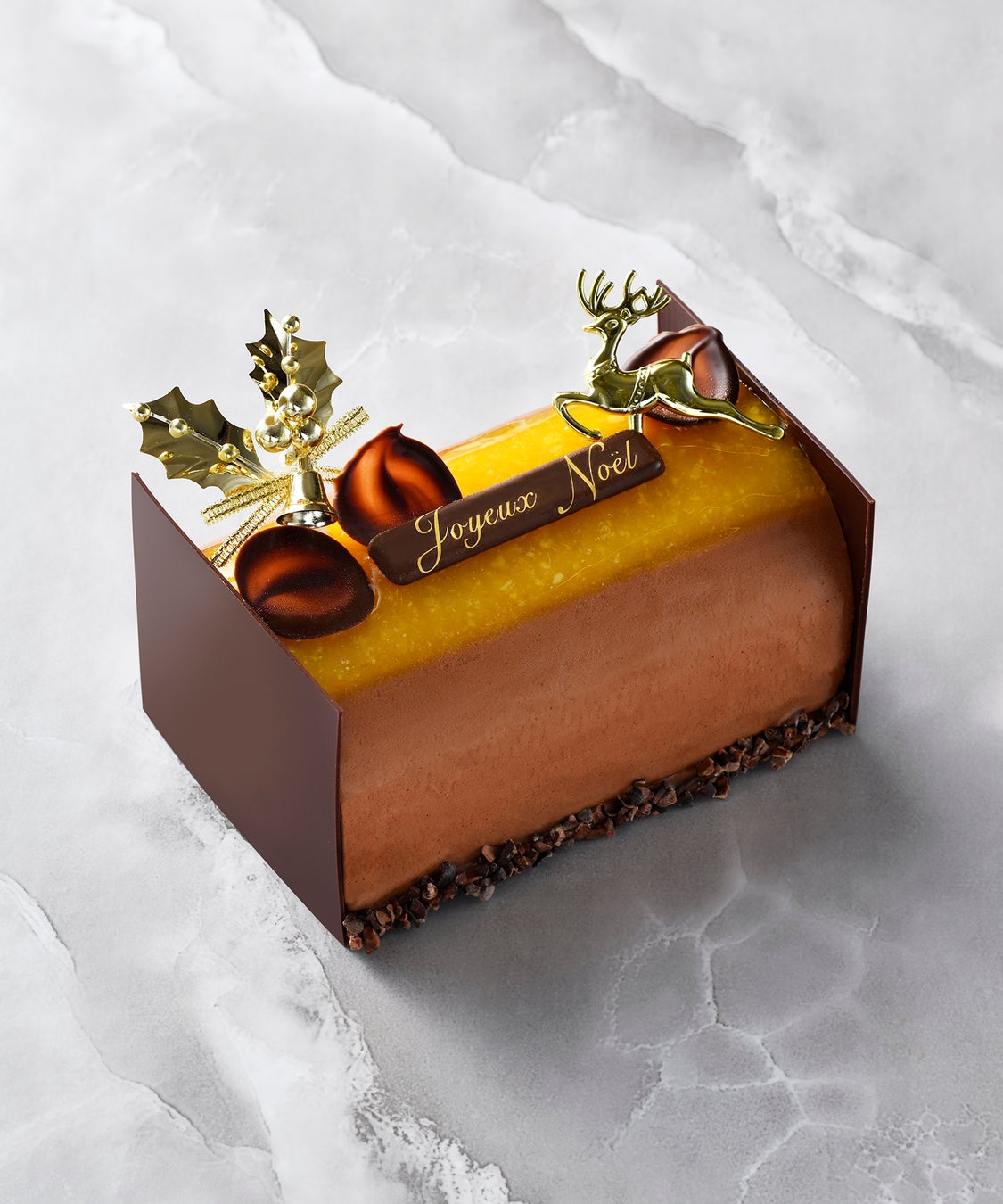 2023年新作のチョコレートとキャラメルのブッシュ・ドゥ・ノエル。7層のチョコレートのガナッシュやクリーム、スポンジ等と、2層のキャラメルのクリームで仕上げました。チョコレート好きにはたまらない、全9層が奏でる奥深い味わいのブッシュ・ドゥ・ノエルをお楽しみください。