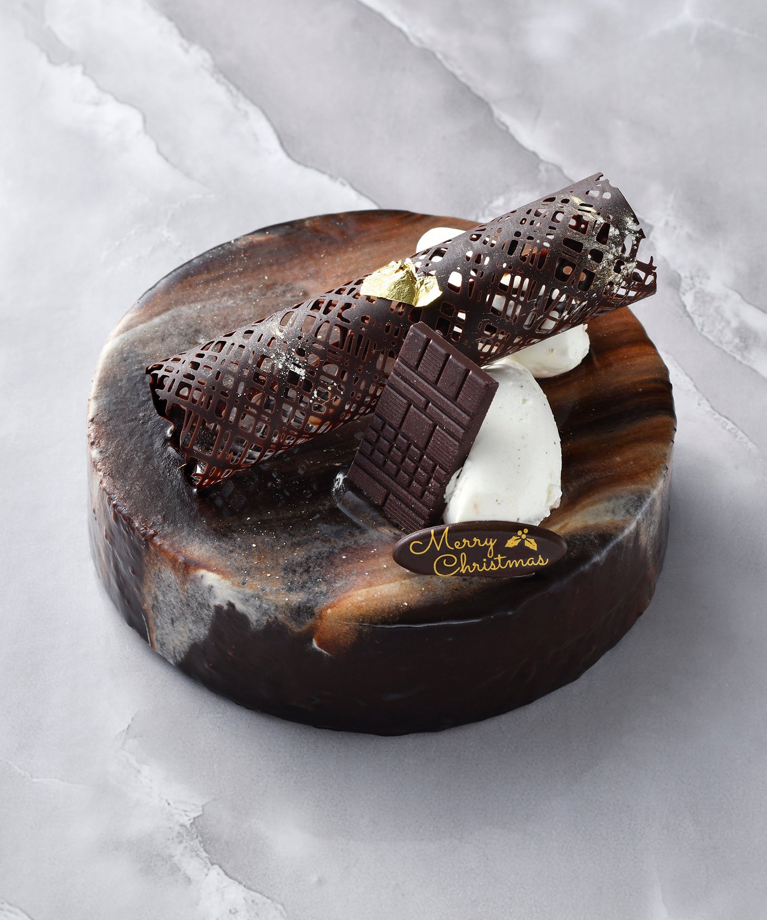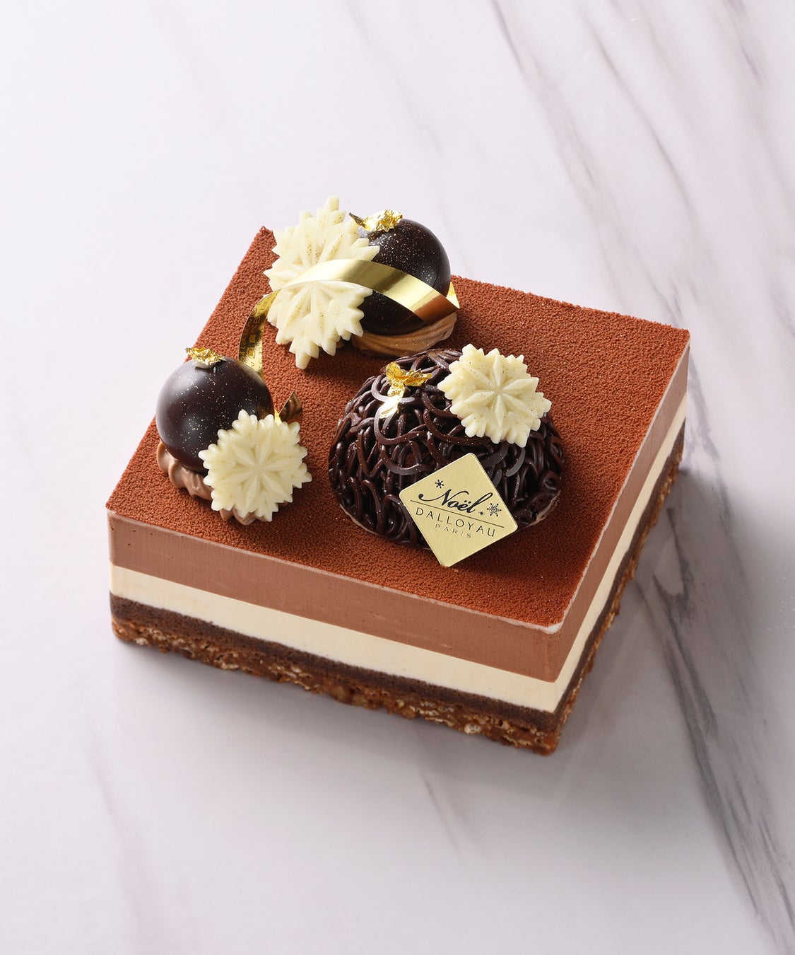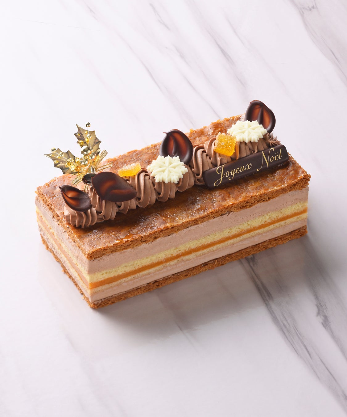 人気のミルフイユをクリスマス使用にドレスアップ。フレデリック・カッセル氏の愛妻Heleneとの絆を深めた「アプリコットのケーキ」から着想を得た、アプリコットを使ったミルフイユをご用意しました。香ばしく焼き上げたフィユタージュ(パイ生地)にコクのあるショコラクリーム、甘酸っぱさのあるアプリコットクーリー(ジュレ)を重ねた華やかな組み合わせは、クリスマスにふさわしい限定ミルフイユです。ヴァローナ社の香り高いミルクチョコレートとブラックチョコレートをブレンドしました。
