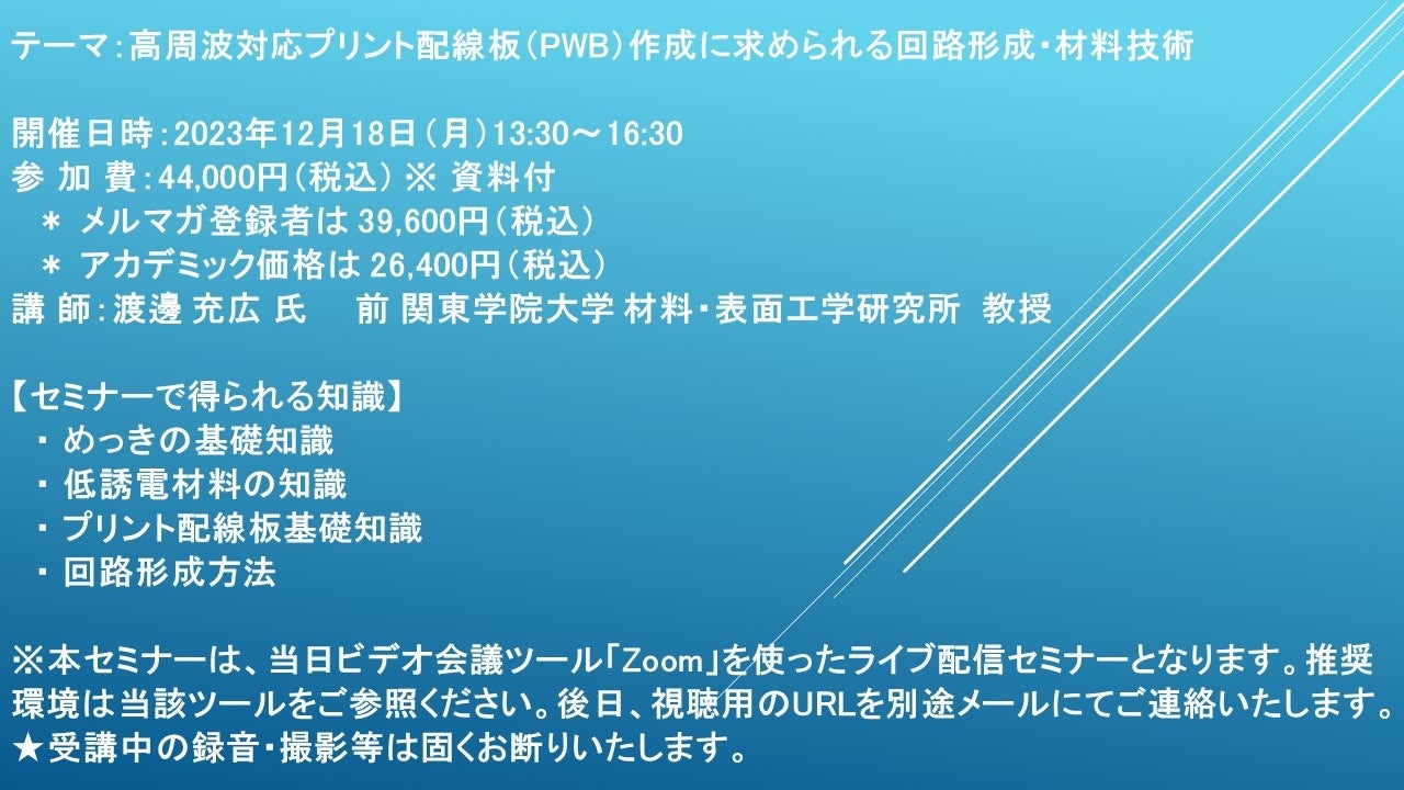 【ライブ配信セミナー】高周波対応プリント配線板(PWB)作成に求められる回路形成・材料技術 12月18日(月)開催 主催:(株)シーエムシー・リサーチ