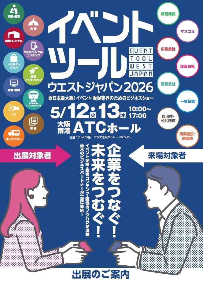 イベント・販促・マーケティング業界に関連する商品・サービスが⼀堂に会するイベント業界の為のビジネスショー『イベントツールウエストジャパン2026』。今年も大阪で開催、現在出展企業を募集中!