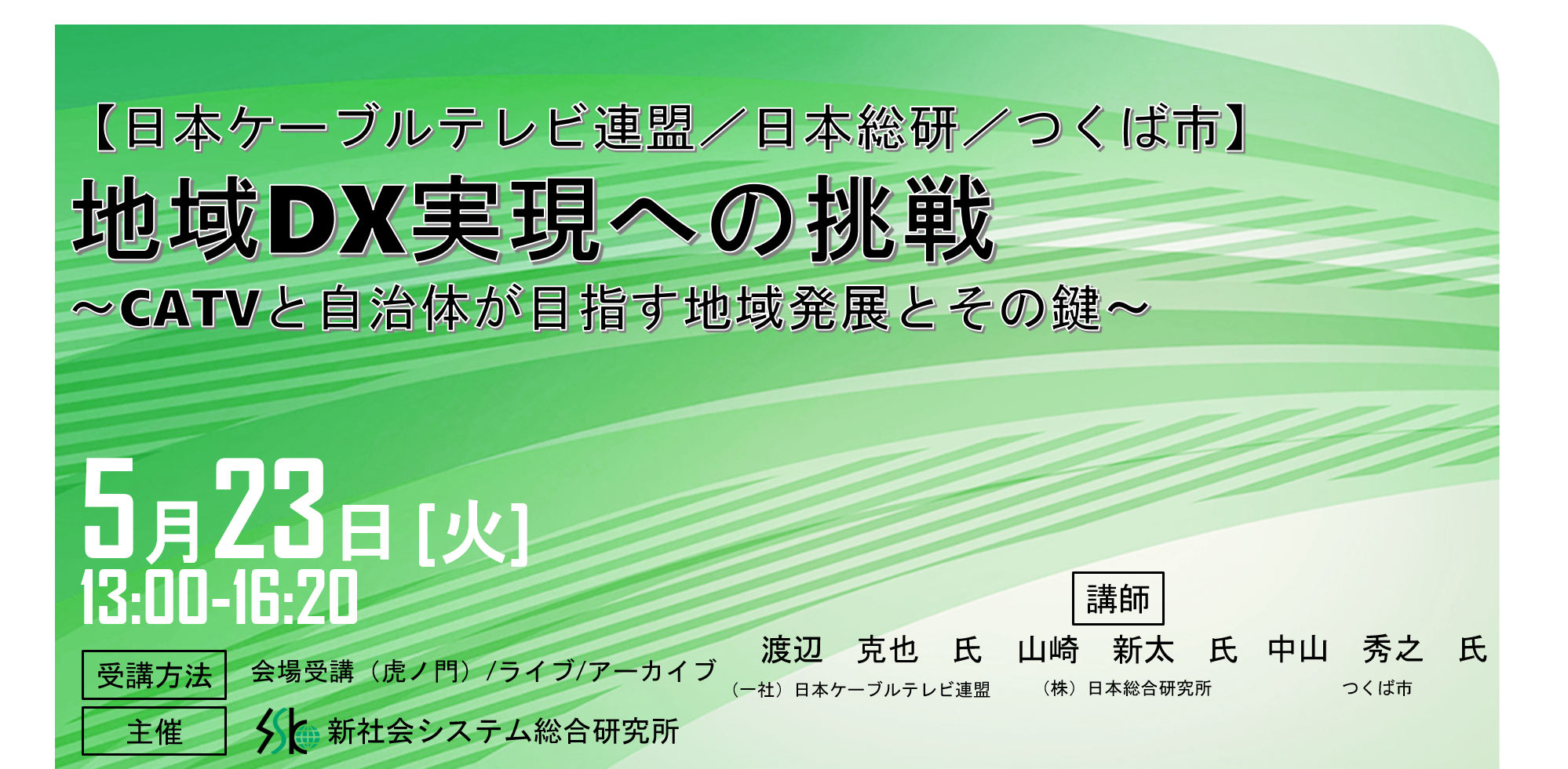 「地域DX実現への挑戦」と題して、(一社)日本ケーブルテレビ連盟 渡辺氏/(株)日本総合研究所 山崎氏/つくば市 中山氏によるセミナーを2023年5月23日(火)に開催!!