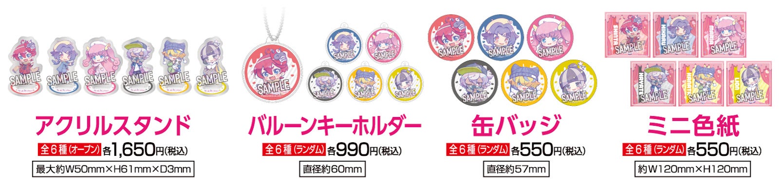 コラボオリジナルグッズは、描き下ろしデザインの「アクリルスタンド【全6種/オープン】」「バルーンキーホルダー【全6種/ランダム】」「缶バッジ【全6種/ランダム】」「ミニ色紙【全6種/ランダム】を、JOYSOUND直営店10店舗の店頭販売及び、オンラインストア(完全予約制)で販売!