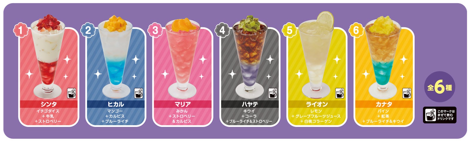 コラボドリンクは、「シンタ」「ヒカル」「マリア」「ハヤテ」「ライオン」「カナタ」各キャラクターをイメージした全6種【各750円(税込)】をご用意します。