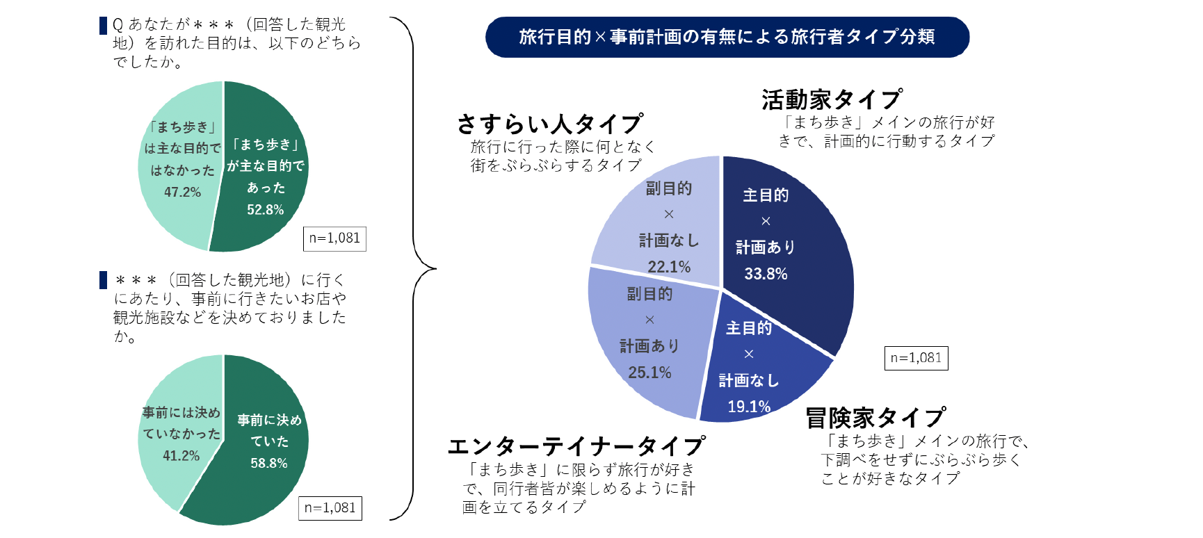 国内の旅行者を対象にまち歩きをした旅行者(日帰りを含む、n=1081)を抽出。目的や来訪スポット、情報収集や消費金額などを質問し、分析しました。まち歩き実施者を、「まち歩き」が主な目的であったかどうか、事前に行きたいお店や観光施設などを決めていたかどうかで、活動タイプ別に4つに分類しています。