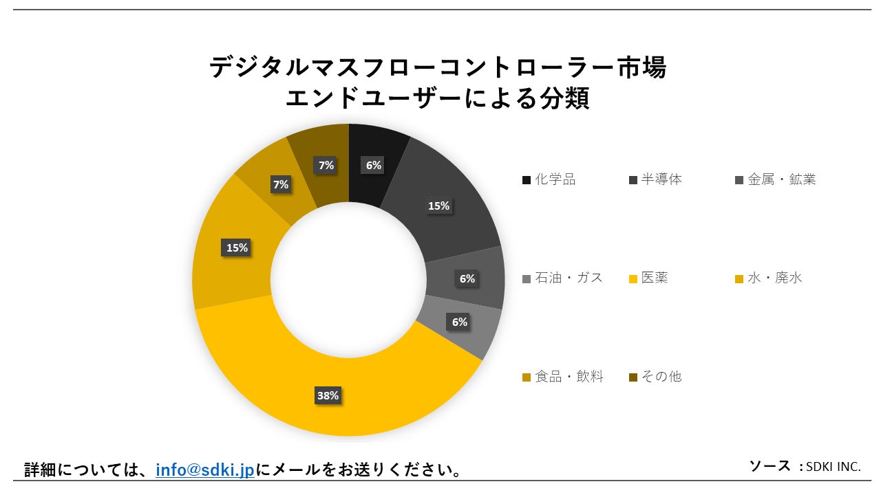 流量に基づいて、低流量のサブカテゴリーが予測期間終了までに最大の市場シェアを占めると予想されます。低流量におけるデジタルマスフローコントローラーは、安定性や精度といった顕著な特徴により、幅広い産業分野での応用に適しています。低流量マスフローコントローラは、半導体チップ製造、ドーピングプロセス、化学気相成長、プラズマエッチングなど、半導体産業における多くのアプリケーションでその用途が見出されています。したがって、この産業における多額の設備投資は、市場にとって有益であると予想されます。世界の半導体産業における資本支出は、2021年から2022年にかけて20%増加し、1820億米ドルに達することが観測されています。低流量マスフローコントローラは、化学産業、科学技術、医薬品、石油・ガス産業、廃水産業、食品・飲料などの他の産業でも使用されています。