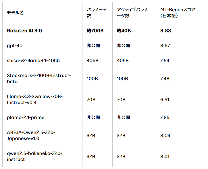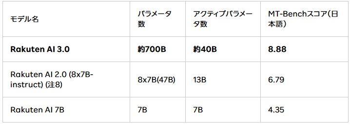 (注4)2025年12月18日時点の開示情報に基づく自社調べ。これまでに楽天で開発した「Rakuten AI 7B」は約70億パラメータ、「Rakuten AI 2.0」は約470億パラメータです。
