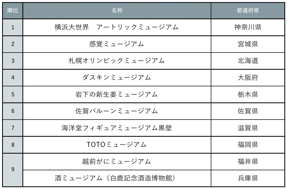 そのほかトップ10には、そこでしか体験できないユニークなミュージアムがランクインする結果となりました。一歩足を踏み入れれば、その世界観にどっぷり浸れるのもミュージアムの魅力。楽しく学べる工夫が満載のスポットは、全国各地にたくさんあります。多くは屋内型なので、雨に濡れる心配がないのもこれからの時期、うれしいポイントではないでしょうか。ぜひランキング結果を参考におでかけしてみてください。