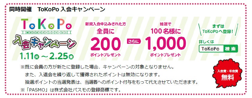 今回の冬の時差Bizキャンペーンは、実施期間を大幅に延長(前回14日間 →今回 28日間して開催するほか、併せて都営交通ポイントサービス「ToKoPo(トコポ )」入会キャンペーンも実施します。まだ入会されていない方は、是非この機会にお申し込みください。