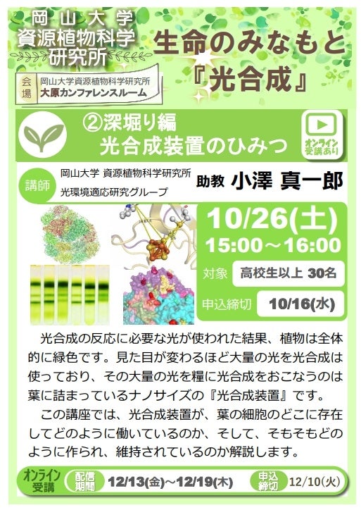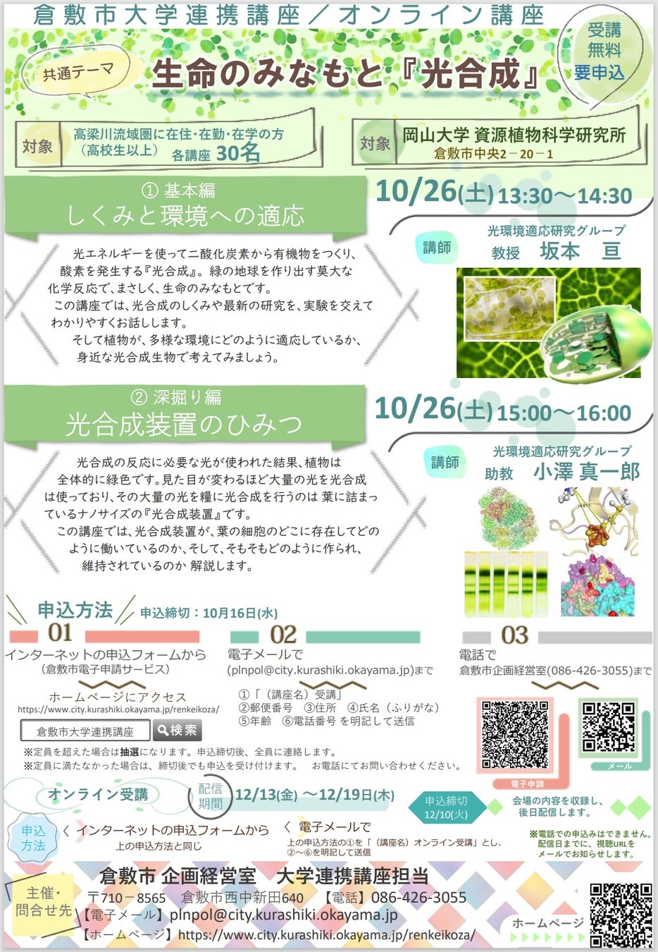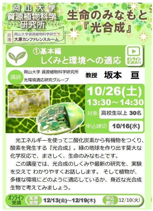 【岡山大学 x 倉敷市】倉敷市大学連携講座「生命のみなもと『光合成』」〔10/26,土 岡山大学資源植物科学研究所〕