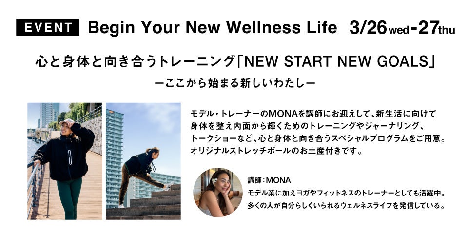 新生活に向けて、「NEW START NEW GOALS ーここから始まる新しいわたしー」をテーマに、トレーニング&ジャーナリングの心と身体と向き合うスペシャルプログラムをご用意。外見の美しさだけでなく、身体を整え内面から輝くためのトレーニングやマインドセットのコツなどを、イベントを通じて体感していただくことで、これから始まる新生活を豊かに過ごすきっかけづくりをお手伝いします。