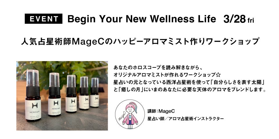 星占い師/アロマ占星術インストラクター・MageCさんによるハッピーアロマミスト制作ワークショップを開催します。ホロスコープを読み解きながら、あなただけのオリジナルアロマミストが作れます。また、同会場にて無料でご参加いただけるおみくじもご用意しています。