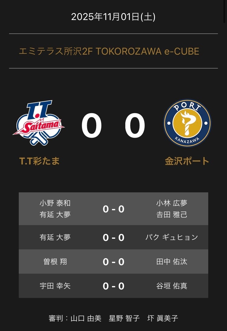 ノジマTリーグ 2025-2026 公式戦 11月1日開催 「T.T彩たまvs 金沢ポート」の対戦オーダーを発表いたします。