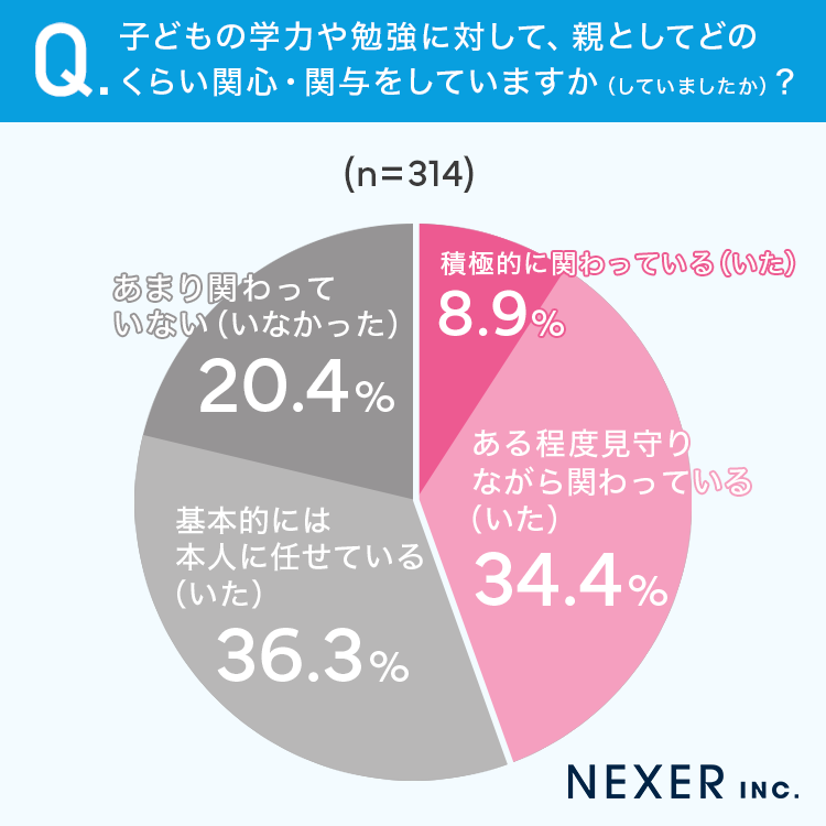 その結果「基本的には本人に任せている(いた)」が36.3%、「ある程度見守りながら関わっている(いた)」が34.4%、「あまり関わっていない(いなかった)」が20.4%、「積極的に関わっている(いた)」が8.9%となりました。