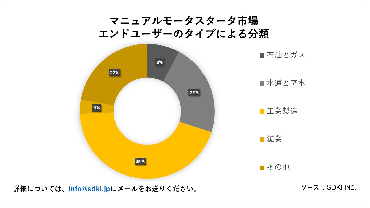 エンドユーザーのタイプに基づいて、工業製造セグメントは、マテハン、梱包、コンベアなどの幅広い産業用途をカバーする世界のマニュアルモータスタータ市場をリードしています。これらのスターターは、これらの産業用途で使用されるモーターを制御するための安全で信頼性の高い方法を提供します。 さらに、産業分野での自動化の適応が進むにつれて、より優れたモーター制御と保護の必要性が高まっています。推定では、工業製造部門が着実かつ一貫した成長を示している一方、石油・ガス、水道・廃水、鉱業などの隣接産業におけるマニュアルモータスタータの需要は、予測期間中にかなりの牽引力を得ることが予想されます。これは、自動機械による環境への影響を削減するという東洋の変化によるものです。