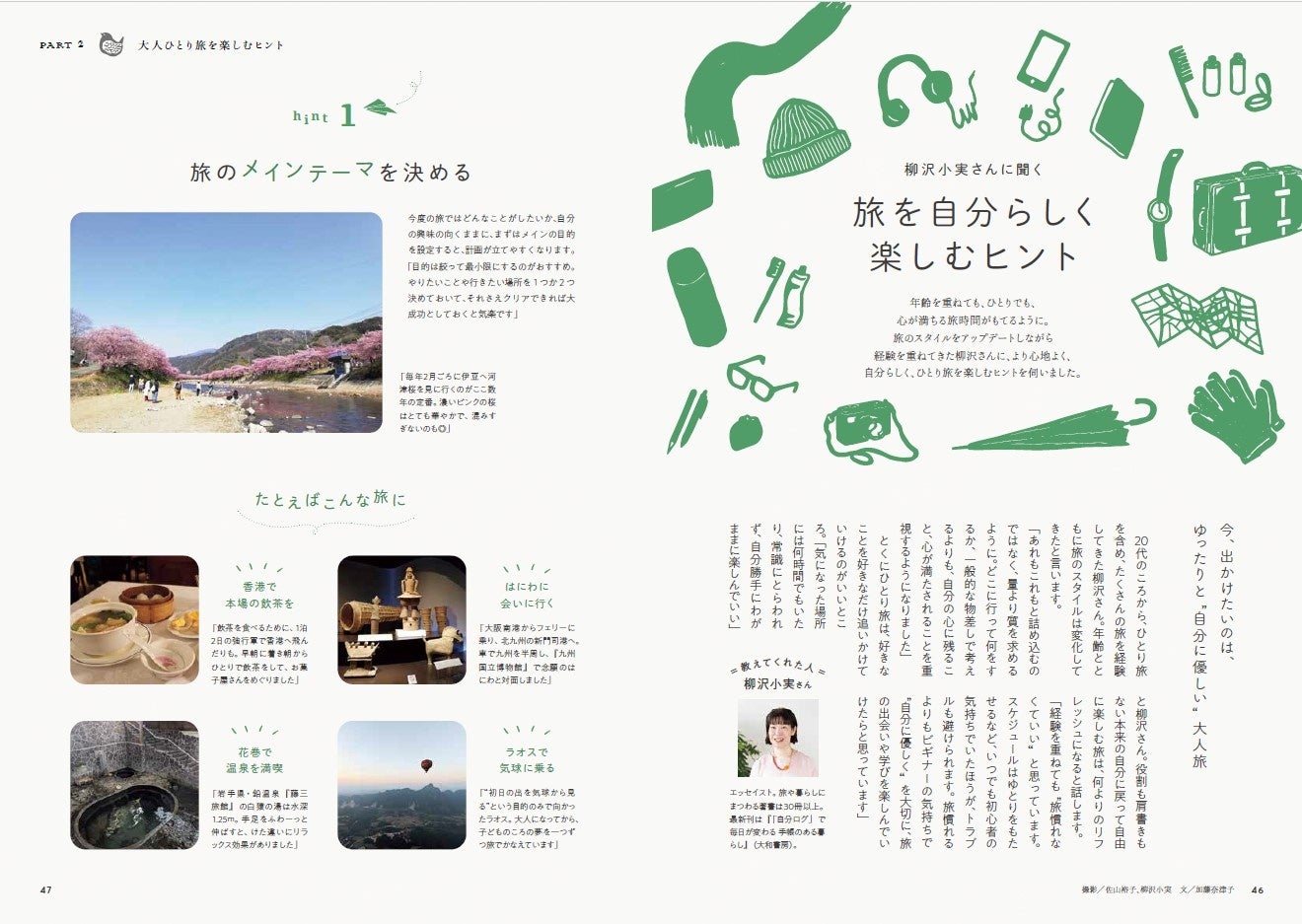香菜子さん、桜井かおりさん、柳沢小実さんなど、旅上手な方々が登場し、旅の計画の立て方からコーディネート、持ち物まで読み物も充実。