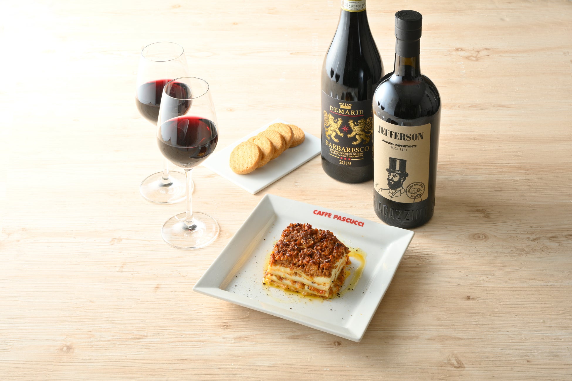 タンニンと瑞々しい酸との調和がとれた「バルバレスコ」は、ひき肉とトマト、濃厚なチーズをたっぷりのせたラザニアと相性抜群。イタリア産のトリュフを生地に混ぜたクッキーや、シトラスとハーブの味わいに心地よい苦味が広がる「ジェファーソン・アマーロ・インポルタンテ」と一緒に、贅沢な大人のひと時をお楽しみください。