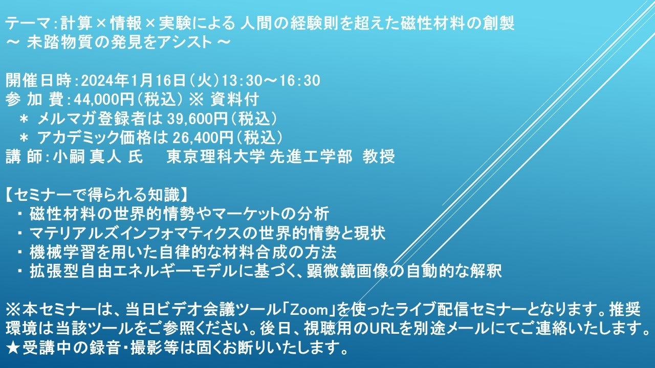 【ライブ配信セミナー】計算×情報×実験による 人間の経験則を超えた磁性材料の創製 〜 未踏物質の発見をアシスト 〜 1月16日(火)開催 主催:(株)シーエムシー・リサーチ