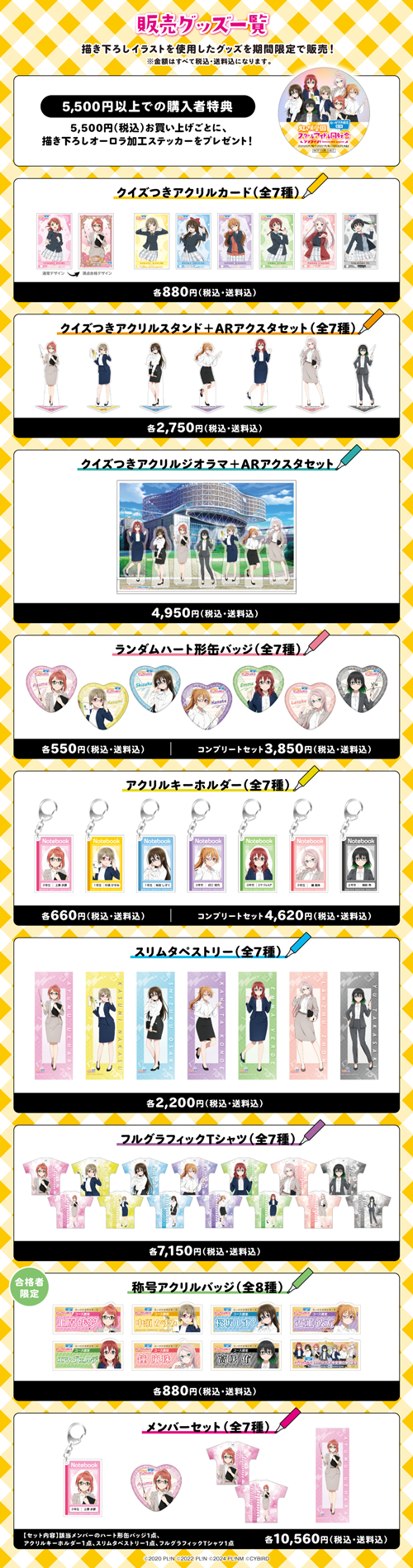 クイズつきグッズの他にも、アクリルキーホルダーやスリムタペストリー、フルグラフィックTシャツなど、描き下ろしイラストを使用した検定オリジナルグッズを多数販売します。
