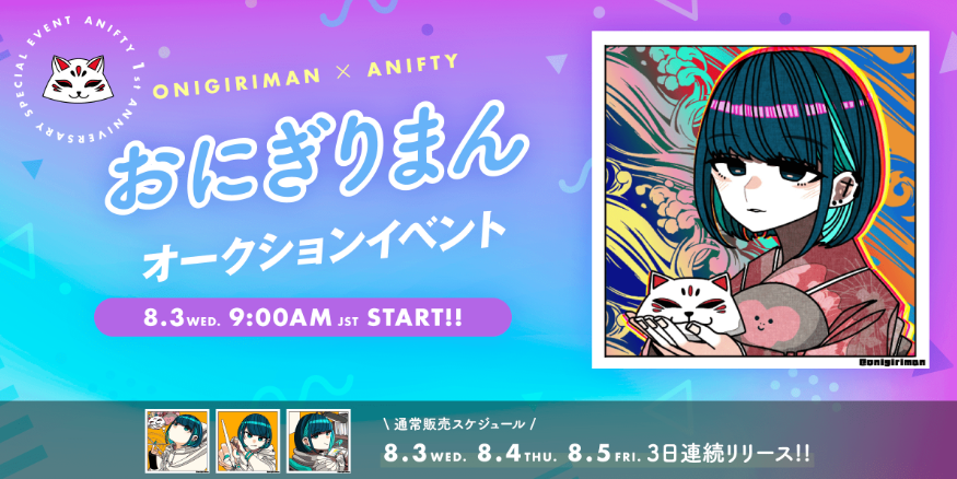 日本アニメ・イラストのNFTプラットフォーム「ANIFTY」1周年記念 日本のトップNFTクリエイター「おにぎりまん」とのコラボ実現 ~ 8/3(水)9:00オークションスタート、通常作品も出品 ~