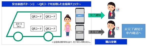 バスの全座席にQRコードを設置し、お子様が降車した後に職員等がスマートフォンアプリ「車内見守り用アプリ(仮称)」でQRコードを読み取ります。お子様が座席などに隠れていても発見できるようQRコードの設置位置を工夫します。全ての座席のQRコードを読み取ると「確認完了」となり、メールで職員室に通知します。
