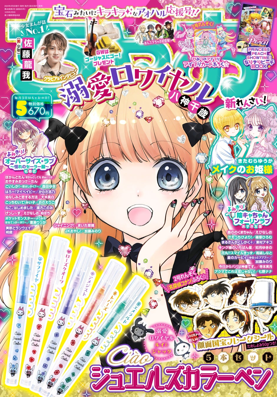 本日4月3日(水) 発売の「ちゃお」5月号は、書きやすくキュートなジュエルズカラーペンがついてくる! カラフルな5色セットだから、手紙をかわいく盛って友達に気持ちを伝えられる新学期にピッタリなアイテムです。 さらにちゃおっ娘にも大人気な『名探偵コナン』(青山剛昌)のフレークシールつき!