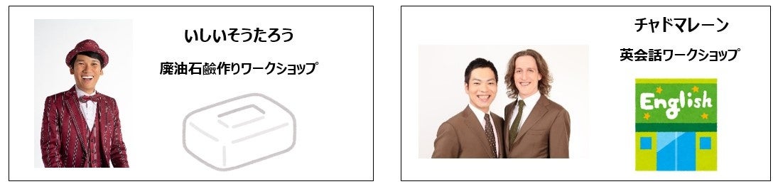 さらに、小中学生のお子様向けに、廃油を使った石鹼作り、楽しく学べる英会話を、吉本芸人が講師となって楽しみながら学べるワークショップ「おでかけよしもと放課後クラブ」も開催いたします。