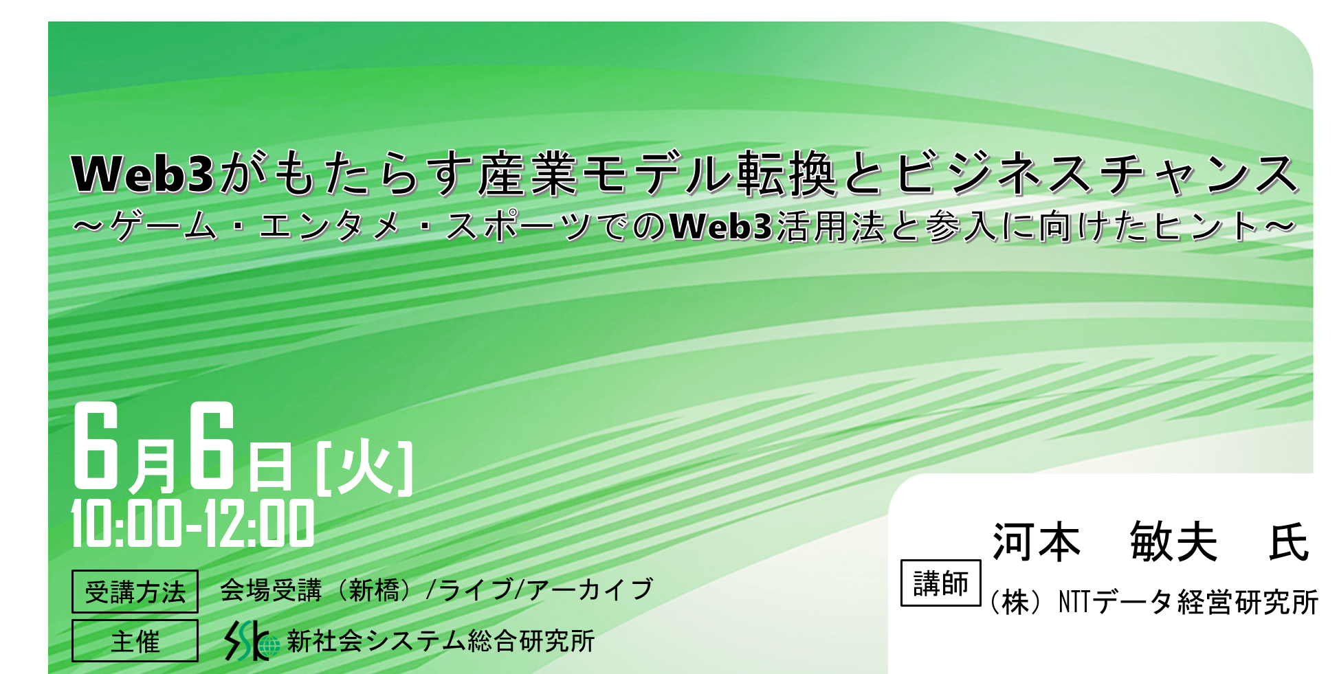 「Web3がもたらす産業モデル転換とビジネスチャンス」と題して、株式会社NTTデータ経営研究所 河本 敏夫氏によるセミナーを2023年6月6日(火)に開催!!