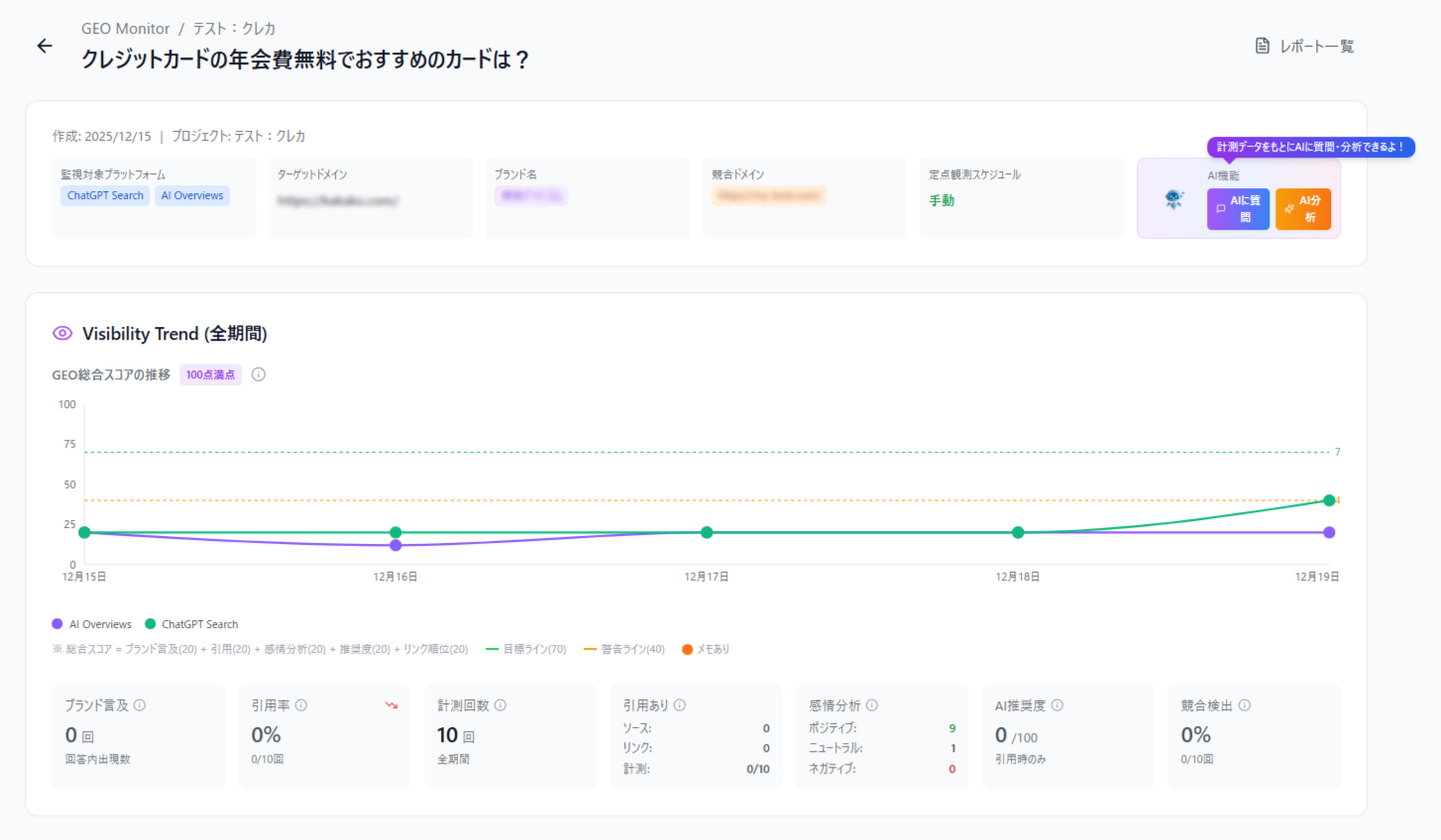 「AI Overviews」や生成AIチャットなどにおいて、指定のドメインやキーワードがどの程度引用・言及されているかを分析する機能