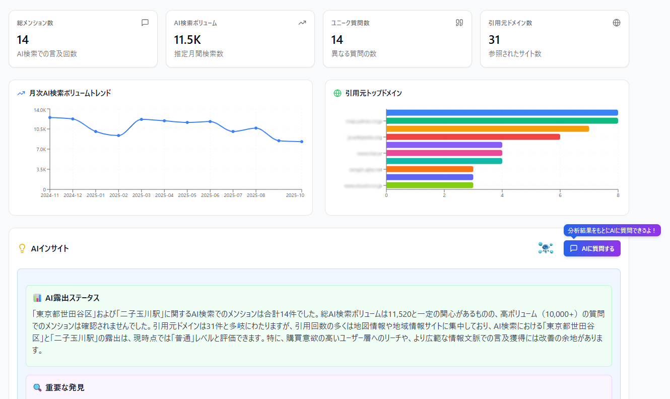 指定したキーワードを含む、AIへの質問・AIの回答・AIが引用や参照したURLを分析し、検索ボリュームや引用数(メンション数)を取得する機能