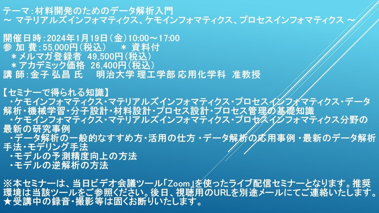 【ライブ配信セミナー】材料開発のためのデータ解析入門 ~ マテリアルズインフォマティクス、ケモインフォマティクス、プロセスインフォマティクス~ 1月19日(金)開催 主催:(株)シーエムシー・リサーチ