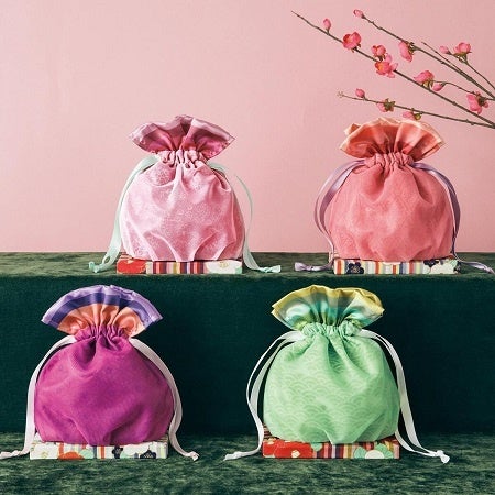 紫式部が書いた平安時代を代表する文学作品『源氏物語』の主人公・光源氏の絶頂期にひらかれた演奏会・女楽のシーンで、女三宮や紫の上など、4人の女君たちが身にまとっていた美しい装束をイメージして生まれたきんちゃくポーチです。