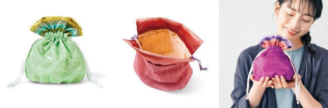 色鮮やかなきんちゃくポーチの袋部分には、当時の装束に使われた非常に薄い絹から着想を得て、シースルー生地を重ねました。