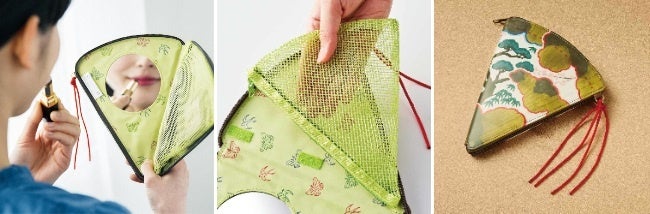 ポーチの内側には、ちょっとしたお化粧直しにも便利な鏡付き。内生地は「蝶鳥文(ちょうちょうもん)」と呼ばれる「蝶」と「鳥」を組み合わせた吉祥文様を表現。コスメなどを入れておけるメッシュポケットは、面ファスナー仕様で取り外しができます。ポーチを閉じると、コンパクトな扇のフォルムになります。使うたびに女房の気分で雅なお化粧直しが楽しめます。
