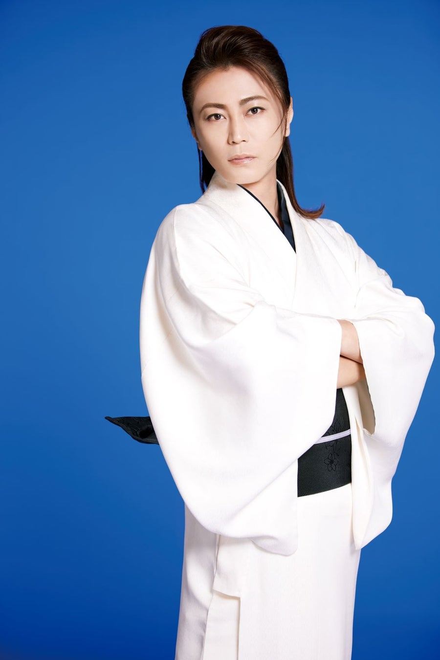 また、シックな薔薇の花柄の黒い着流しで椅子に座って真摯なまなざしを見せるカットも収録。