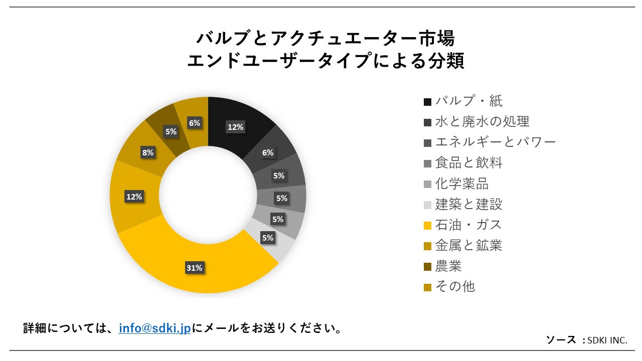 エンドユーザータイプに基づいて、石油・ガス産業セグメントは世界のバルブとアクチュエータ消費量の約 25% を占めています。この推定は、このセグメントが予測期間中に世界のバルブとアクチュエータのエンドユーザーセグメントを支配すると予想されており、このセグメントが着実に成長していることを示しています。これらの推定は、いくつかの業界にわたって絶え間なく増大するエネルギー需要に根ざしています。バルブとアクチュエーターーは、石油・ガス採掘とプロセスインフラにおいて最も重要な部品の一つであり、圧力と温度を調整するために過酷な条件で動作し、日々の採掘と処理作業の純度と効率に直接貢献する傾向があるためです。さらに、石油・ガス産業では危険と隣り合わせのため、バルブとアクチュエーターーは安全性を確保するために不可欠なものです。