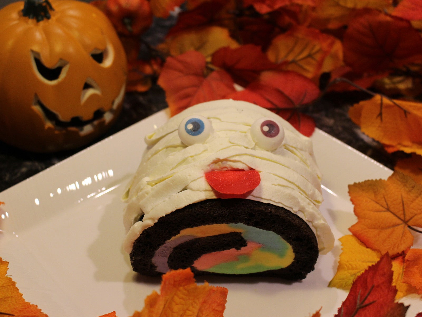 ホテル客室の6色あるコンセプトカラーに因んだふわふわホイップクリームを包み込んだロールケーキを、たっぷりの生クリームで“ミイラ男の包帯”のようにコーティングした「ミイラ男のロールケーキ」。