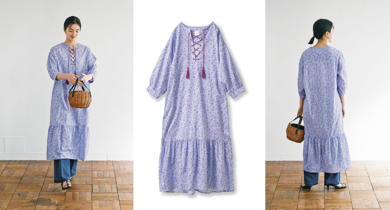 ボタニカルプリントの可憐な花柄のワンピースです。フロントの編み上げのスピンドルコードや、先端に付けたタッセルは、長さやボリューム、色の組み合わせを考え抜かれたこだわりのアクセントです。すそのティアードデザインは、大人でも着やすいよう切り替え位置を低くしています。