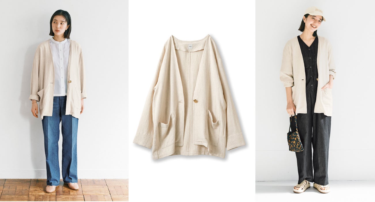 明るめのオートミールカラーで、ドライな質感の麻混レーヨンのジャケットです。ノーカラーかつシングルボタンですっきりと仕立てています。袖をまくった際に美しく見える見返しや、フロントのパッチポケットなど、おしゃれの格を上げる仕掛けも随所にあり、シャツやカーディガン感覚で気楽に使えます。