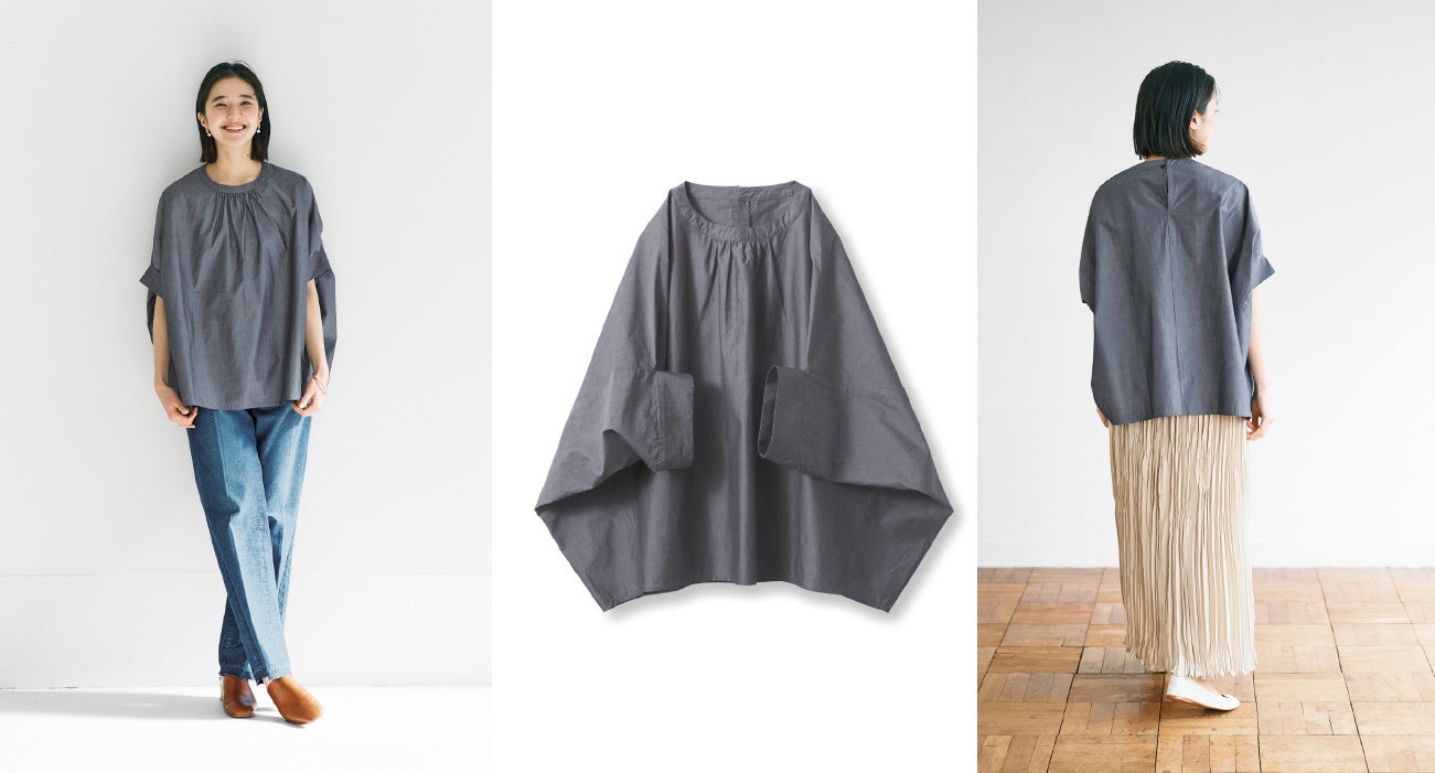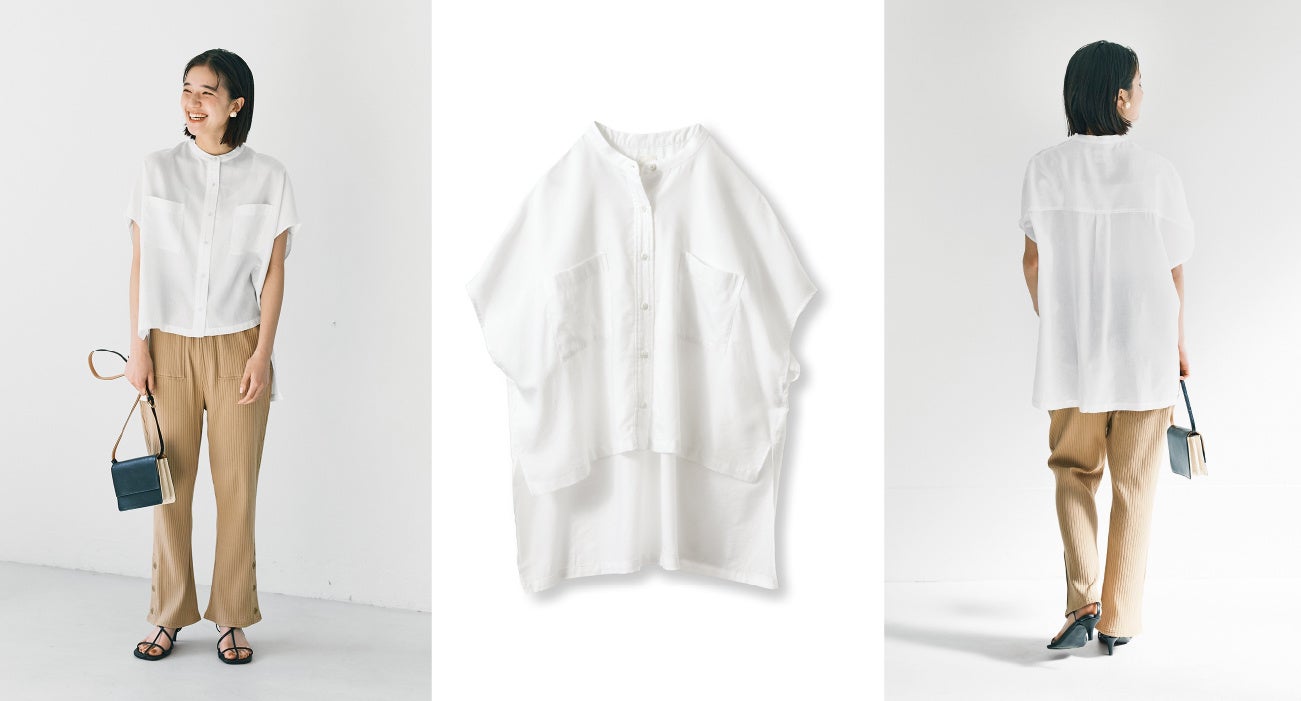 ボックスシルエットのバンドカラーシャツです。前後差を大胆につけたすそや、タックが入った後ろヨークなど、全方位どこから見ても遊び心とデザイン性を兼ね備えています。ほどよく落ち感のあるシアーな生地でスタイルを選ばず着こなせます。